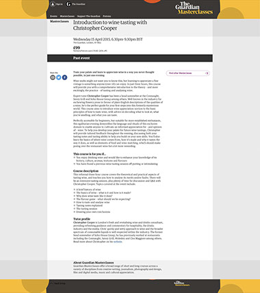 With inspirational lectures in the fields of creative writing, journalism, business, lifestyle and personal development, the ‘Guardian Masterclasses’ are a seminal programme of events that puts attendees in the same room as other higher-thinking like minds from across the globe… showcasing award-winning guest speakers such as novelists, Guardian journalists, trailblazing entrepreneurs and industry-leading experts; all demonstrating their respective skills and experiences. Within this inspiring interactive arena of conversation and discovery, Christopher Cooper devised, pitched, curated and delivered a hugely popular 12 month programme of consumer facing ‘how to…’ masterclasses of wine including: “How to taste wine”, “How to become a wine expert”, and “Know your Champagnes from your Sparkling”. Hosting with his own unique brand of vibrant wine-speak and trademark affable awkwardness, Christopher brought his liquid creativity to the fore, on screen, in the glass and in the atmosphere of every event. With his effervescent engaging persona and an indiscernible likeablity, Cooper presented on topic to sell out crowds at The Guardian Newspapers HQ in Kings Cross, bringing with him his carefully selected portfolio of products from secured sponsorship partner, Lea & Sandeman.