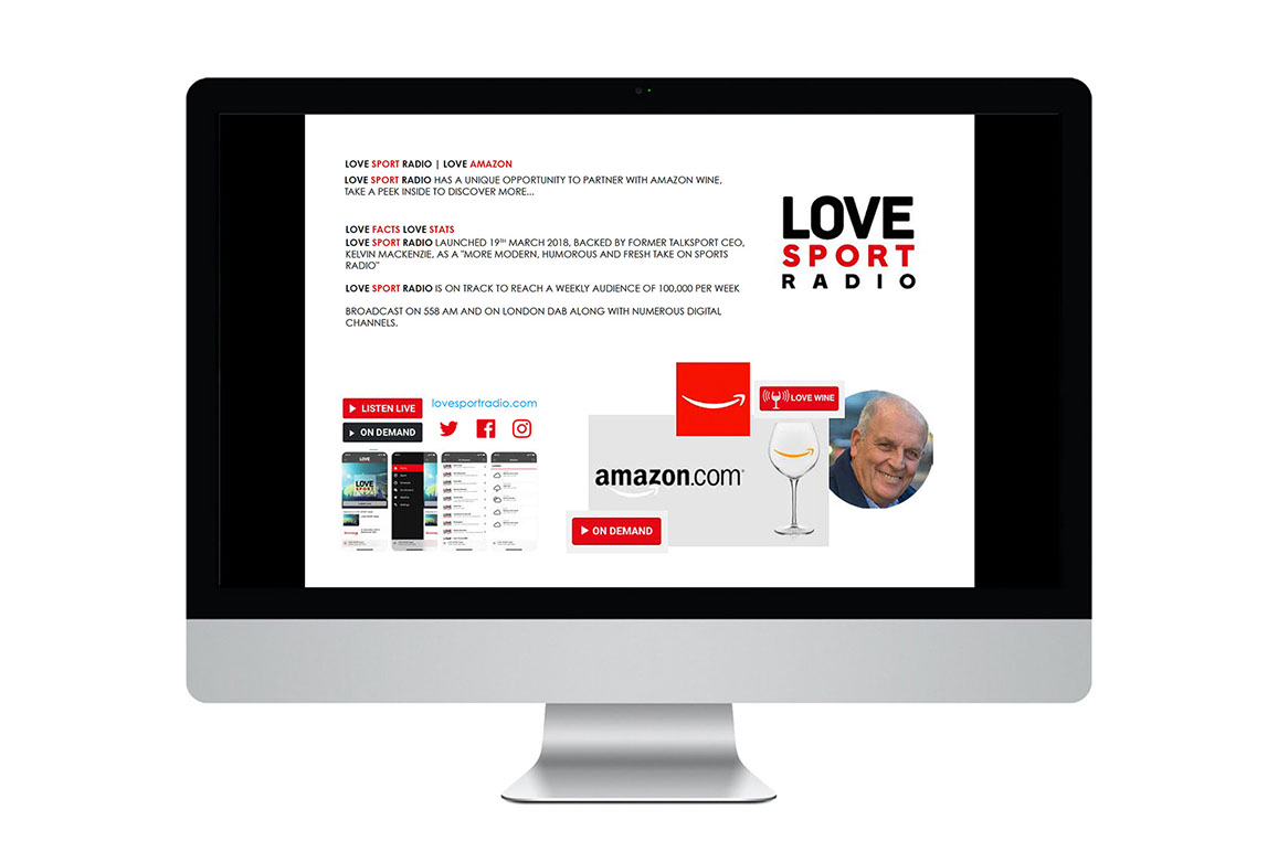 Love Sport Radio was launched in March 2018 by former talkSPORT CEO Kelvin Mackenzie, as a more modern, humorous and fresh take on sports radio, whilst capitalising on the growth in talk radio stations. Appearing as a one-off guest expert during the drive-time show, Christopher took part in a topical and engaging wine tasting challenge live on-air with host, Kelvin Mackenzie. Following on from this highly successful wine tasting feature, Love Sport Radio commissioned Christopher to embark on devising a regular wine tasting slot, exploring themes, partnerships and sponsorship opportunities. Working in coordination with Love Sport Radio and Cooper's team at Drinkonomics Productions, a brief was devised to create a pitch to the online grocery retail arm of Amazon to become the official partner of a newly created LOVE DRINKS half-hour entertainment lifestyle wine tasting slot, featuring wine expert Christopher Cooper, anchor Kelvin Mackenzie and 'Love Sport at Lunch' host Patrick Christys. An interactive PDF document was designed with embedded components, including an audio clip showcasing a previous live broadcast wine tasting feature between Kelvin and Christopher. The pitch reinforced each of the partners' existing branding to create a persuasive augmented relationship building document, to open up opportunities between potential sponsor, talent and broadcaster.
